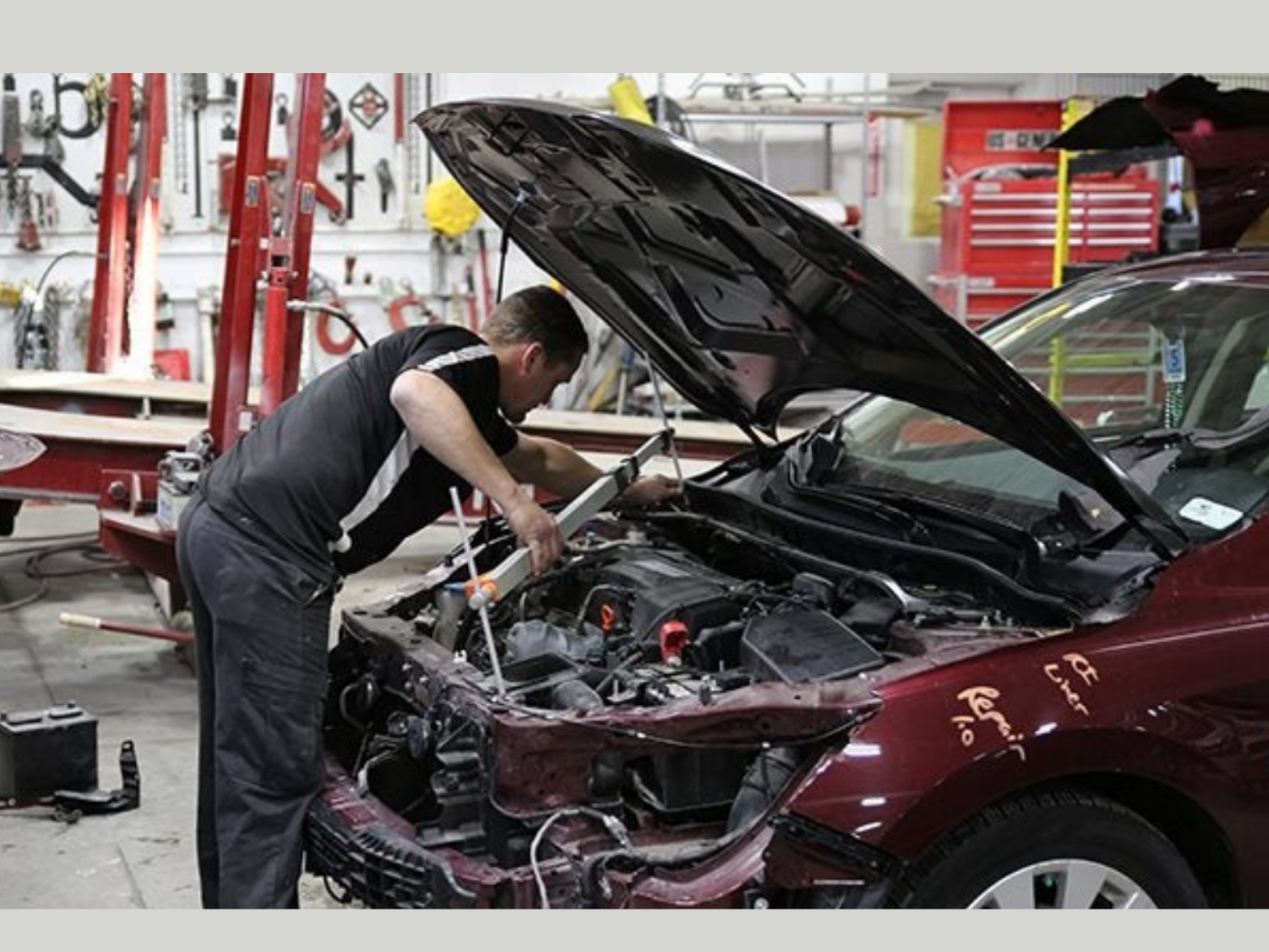 Certified Rydell car repair technician working on a vehicle involved in an accident.
