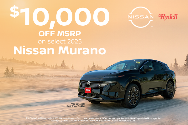 Vin: SC143037 Rydell Best Price: $39,996 Disclaimer: $10,000 off MSRP on select 2025 Nissan Murano from new dealer stock. Offer not compatible with NMAC special APR or special lease programs. Discount reflected in Rydell Best Price. Offer Ends 02/28/2026.